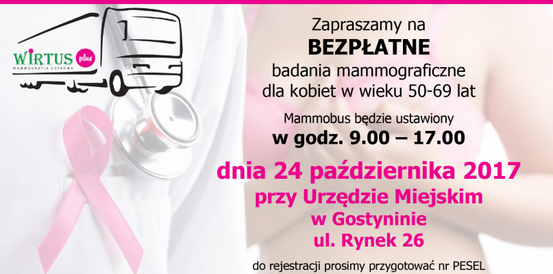 W związku z ogólnopolskim Programem Profilaktyki Raka Piersi realizowanym przez Narodowy Fundusz Zdrowia, zapraszamy mieszkanki Gostynina i okolic do wzięcia udziału w BEZPŁATNEJ mammografii. Badania przeprowadzone zostaną w godz. 09:00 - 17:00 przy Urzędzie Miejskim w Gostyninie, ul. Rynek 26 i adresowane są do kobiet w wieku 50-69 lat.*