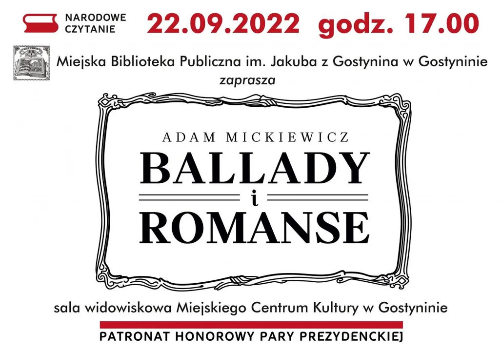 Narodowe Czytanie w miejskiej bibliotece zaplanowano na godzinę 17:00 w sali widowiskowej Miejskiego Centrum Kultury. To tam wybrzmią Ballady i Romanse naszego wieszcza narodowego doby romantyzmu.