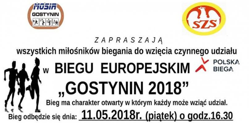 Miejski Ośrodek Sportu i Rekreacji w Gostyninie oraz Szkolny Związek Sportowy organizują „Bieg Europejski Gostynin 2018". Impreza odbędzie się w piątek 11 maja o godzinie 16.30 na stadionie im. Janusza Kusocińskiego w Gostyninie.