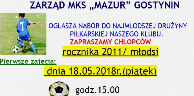Pierwsze zajęcia dla chłopców z rocznika 2011 i młodszych odbędą się na Orliku przy Szkole Podstawowej nr 1 w piątek 18 maja o godzinie 15.00. Zajęcia prowadził będzie trener piłki nożnej Mazura Gostynin – Przemysław Woźniak.