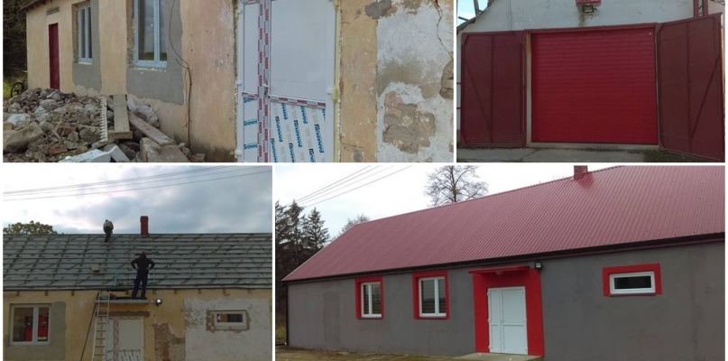 Można rzec, że w budynku zmieniło się dosłownie wszystko. Zakres wykonanych prac obejmował m.in: utylizację obecnego eternitowego poszycia dachowego i zastąpienie go nowym, wymianę posadzki podłogowej w części świetlicowej, wymianę okien i drzwi, adaptację części świetlicy na zaplecze kuchenne oraz łazienkę wraz z jej wyposażeniem, budowę przyłącza wodociągowego, naprawę i malowanie elewacji zewnętrznej i wewnętrznej, wymianę instalacji elektrycznej, wymianę wrót garażowych, czy wymianę oświetlenia na zewnątrz i wewnątrz budynku. Zakupiono również urządzenie olejowe do ogrzewania pomieszczeń.