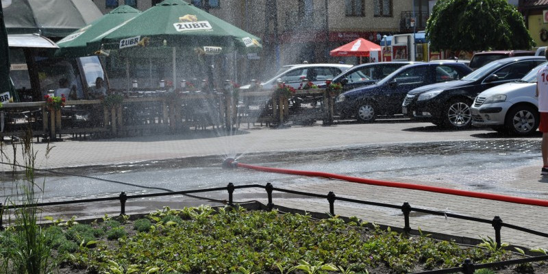 Burmistrz Paweł Kalinowski zapewnia mieszkańcom wodną klimatyzację uruchomioną dzięki przychylności Ochotniczej Straży Pożarnej. Można z niej skorzystać na gostynińskim Rynku.