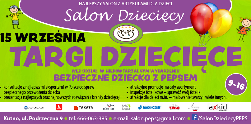 Już w tą sobotę (15.09) odbędzie się niepowtarzalne wydarzenie- Bezpieczne Dziecko z PEPS'em! Specjalnie dla przyszłych i obecnych rodziców zorganizowane zostanie spotkanie z najlepszymi ekspertami w Polsce ds. bezpiecznego przewożenia dziecka. Eksperci marek takich jak m.in. Maxi-Cosi, Britax Romer, Avionaut, Chicco, Axkid, Takata - zaprezentują najnowsze rozwiązania z zakresu ochrony dziecka - innowacyjne foteliki, najnowsze systemy bezpieczeństwa i wiele więcej, Dla wszystkich zainteresowanych przewidziana będzie specjalna oferta dostępna tylko podczas targów. Ponadto wózki Tutek, Baby Jogger, Britax Romer, Chicco, Junama - w specjalnej ofercie.