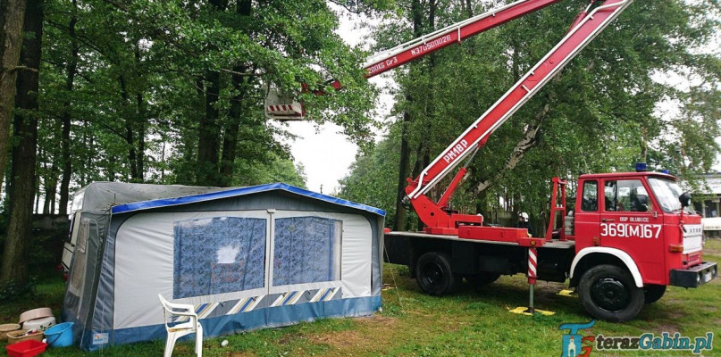 Jak informuje współpracujący z nami portal TerazGąbin.pl strażacy z Gąbina zostali wezwani na teren jednego z ośrodków wczasowych w Koszelówce gdzie od silnego wiatru złamało się drzewo i zawisło nad namiotem i przyczepą kempingową stanowiąc ogromne zagrożenie dla wczasowiczów. Strażacy po dojeździe na miejsce zabezpieczyli miejsce zdarzenia i upewnili się, że w środku nikogo nie ma. Aby usunąć zagrożenie konieczne było zadysponowanie na miejsce podnośnika z koszem ratowniczym, którym w najbliższej okolicy dysponują strażacy z Płocka i Słubic.