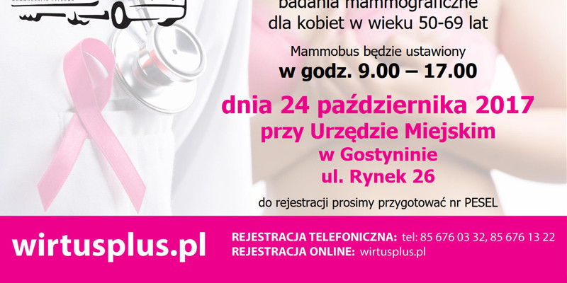 Zachęcamy panie w wieku 50-69 lat do udziału w bezpłatnych badaniach mammograficznych organizowanych 24.10.2017r. w godz. 09:00 - 17:00 przy Urzędzie Miejskim w Gostyninie, ul. Rynek 26.