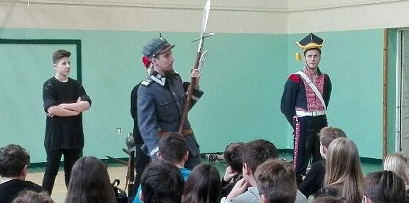 Spektakl, który został zaprezentowany uczniom najstarszych klas Trójki, miał charakter interaktywny. Aktorzy ubrani byli w kostiumy nawiązujące do różnych epok naszej historii. Barwnie, żywo i z umorem prezentowali tragiczne, ale i chwalebne dzieje naszego narodu.